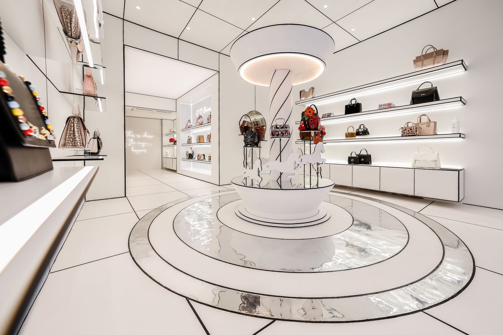 Lo studio dell’architetto Emanuele Svetti ha progettato il nuovo negozio Braccialini, nel centro storico di Firenze. Situato al N. 81 di via dei Calzaiuoli, lo spazio occupa una superficie di 200 mq, su due piani, con una vetrina su strada. Gli ambienti ruotano attorno a punti focali che creano percorsi fluidi e delineano spazi “magici”. Una trottola, una giostra, un totem costruito con dadi da gioco: questo è il mondo di una donna che vuole immergersi in una fiaba, e si circonda dei suoi accessori preferiti.