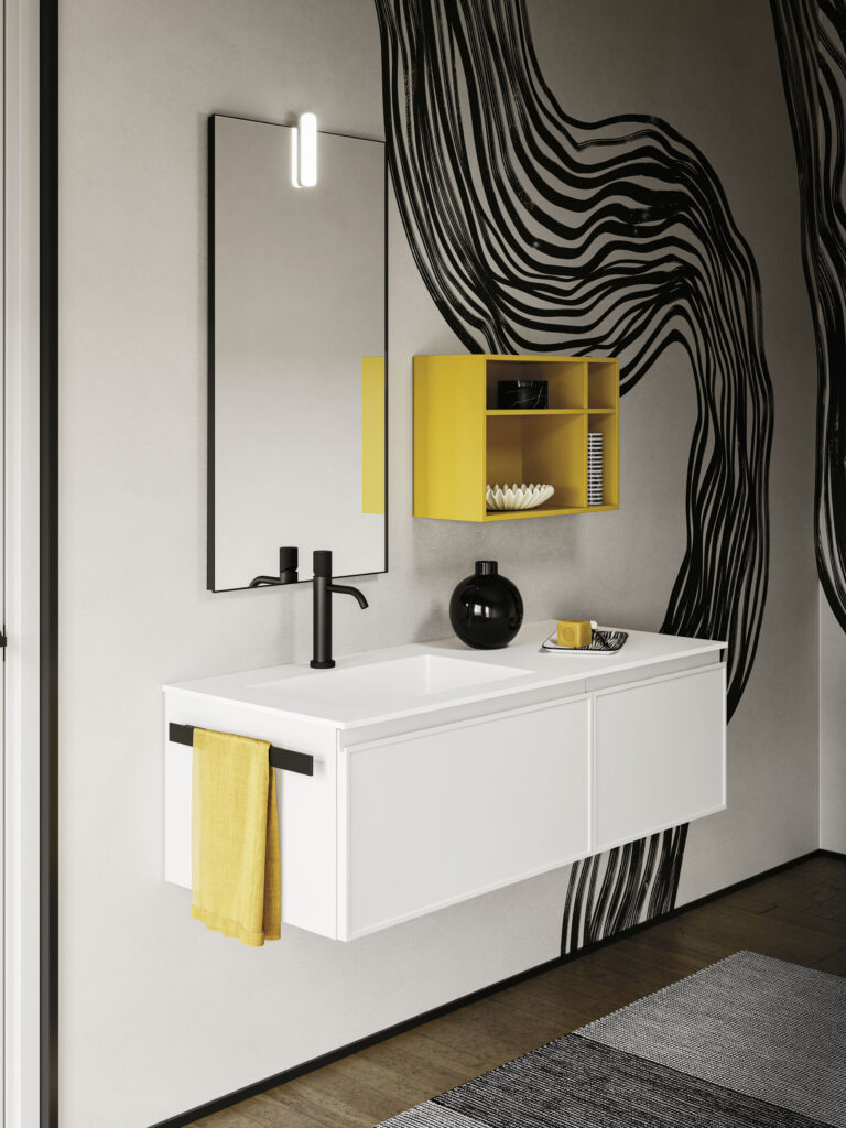 I mobili Decor arricchiscono il bagno con ante senza maniglia e presa integrata J, linee pulite e 56 finiture laccate opaco. Design versatile e modulare, adatto sia a bagni moderni che tradizionali, per composizioni personalizzabili e armoniose.