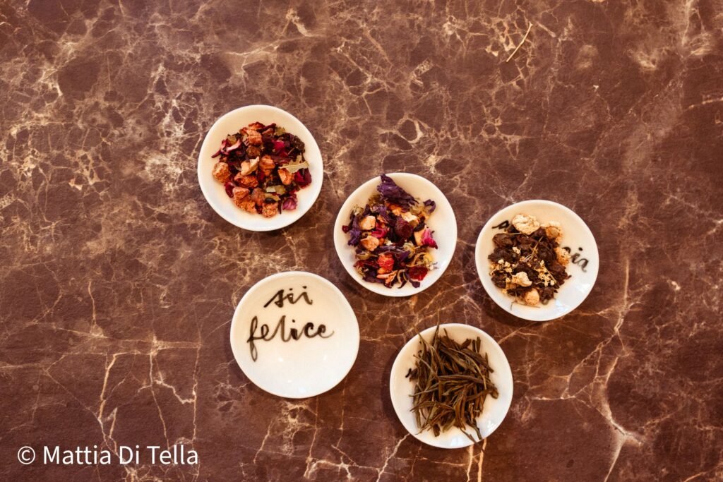 La carta di Momenteeria raccoglie circa sessanta referenze, tutte acquistabili. Tè monorigine pregiati, importati direttamente dalla Cina e certificati dall’Associazione Italiana Tè e Infusi, convivono con blend originali arricchiti da botaniche italiane.