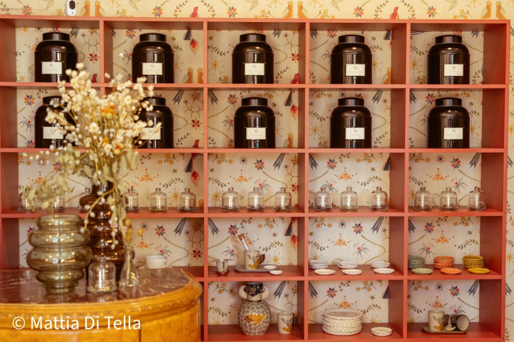 Il progetto d’interni, firmato da Paola Podenzani, sviluppa uno spazio di 150 mq su due livelli. Al piano terra si trovano bancone e boutique con tè, infusi, tisane e regali per momenti felici, dominati da un bancone vintage restaurato che restituisce eleganza e memoria.