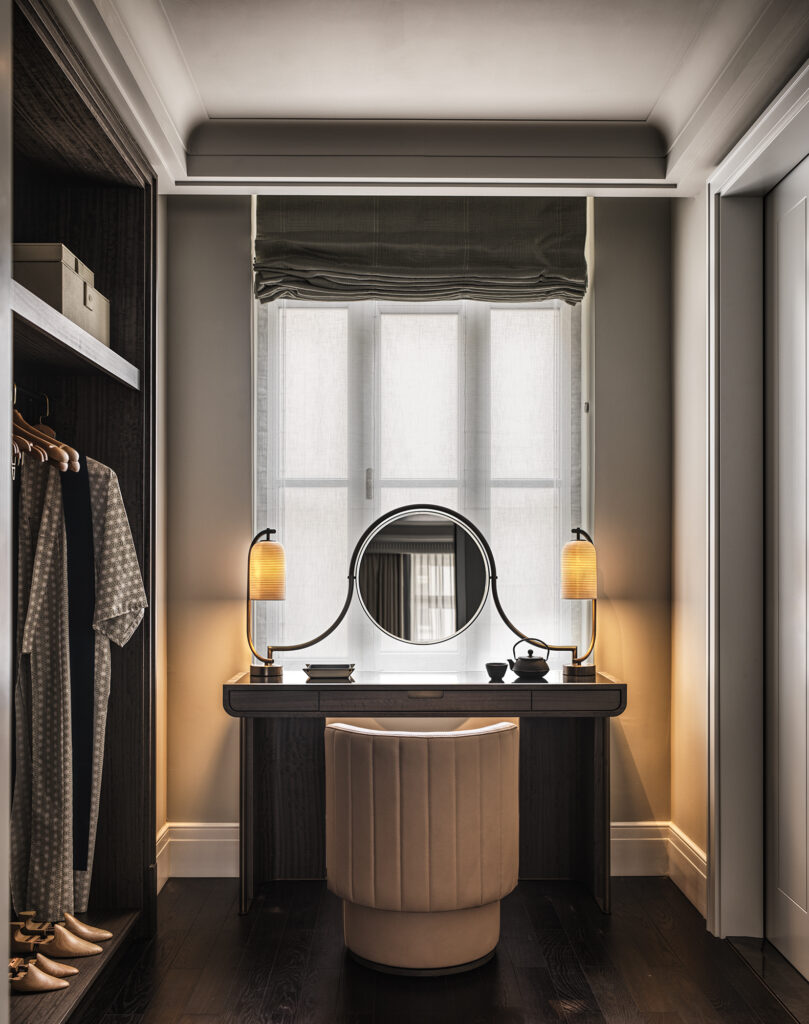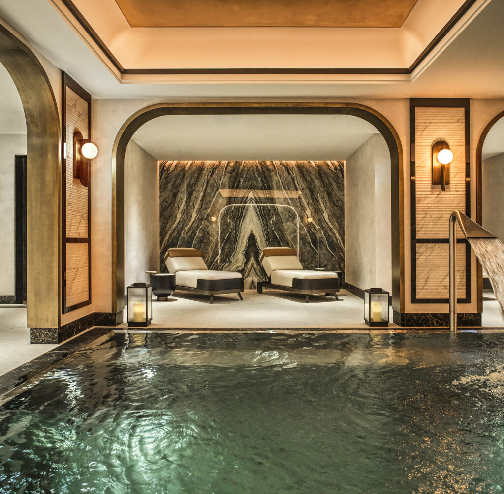La palette materica combina intonaci chiari, marmi figurati e legni naturali tinti, arricchiti da dettagli in ottone anticato e inserti in foglia d’oro. Le soluzioni illuminotecniche su misura, realizzate da artigiani locali, rafforzano l’attenzione alla provenienza e al valore del saper fare.