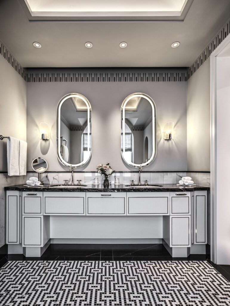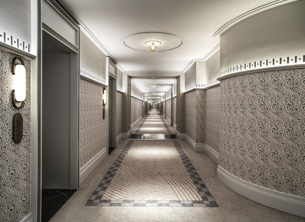I bagni adottano una tavolozza senza tempo in bianco e nero, con pavimenti a mosaico e dettagli grafici calibrati. Corridoi e suite proseguono il racconto visivo attraverso rivestimenti dipinti a mano e tappeti personalizzati, derivati ​​dai motivi originari dell’edificio.