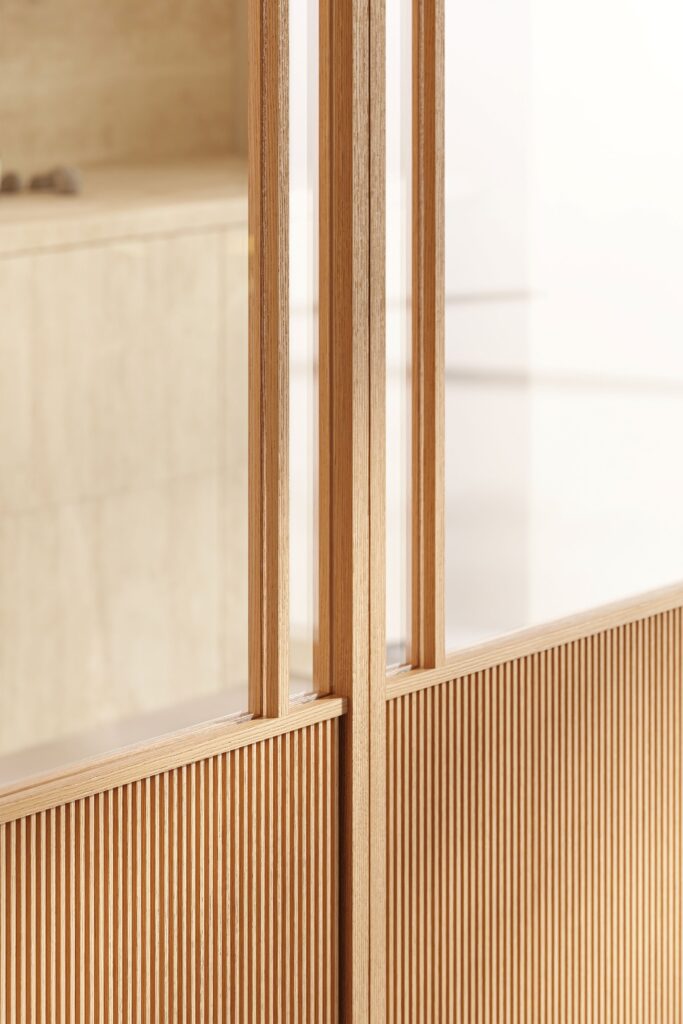 In questi sistemi divisori di design, il legno agisce come uno strumento architettonico. Modula, infatti, la percezione visiva, interrompe la continuità vitrea e definisce una soglia materica che dona carattere alla stanza. I traversini in alluminio completano il disegno, creando giochi grafici raffinati che danno ritmo alle pareti mobili e dialogano armoniosamente con l’architettura circostante.
