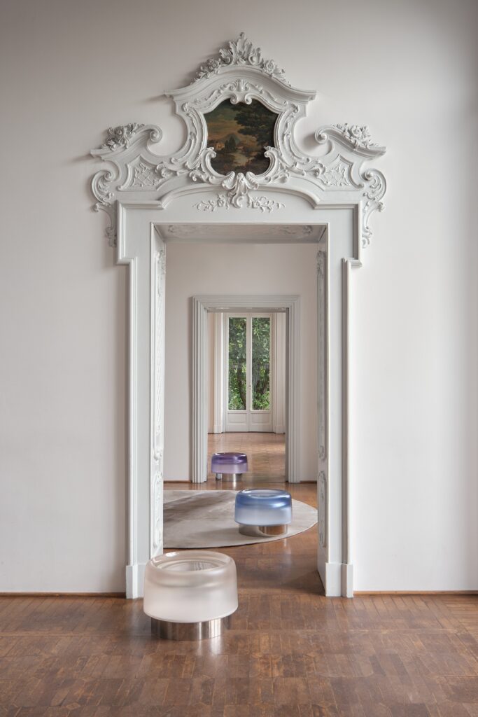 - HOOP: un’indagine sulla luce ispirata a James Turrell. Un disco in resina che sembra levitare nello spazio grazie a una base in acciaio a specchio che scompare nell’ambiente.