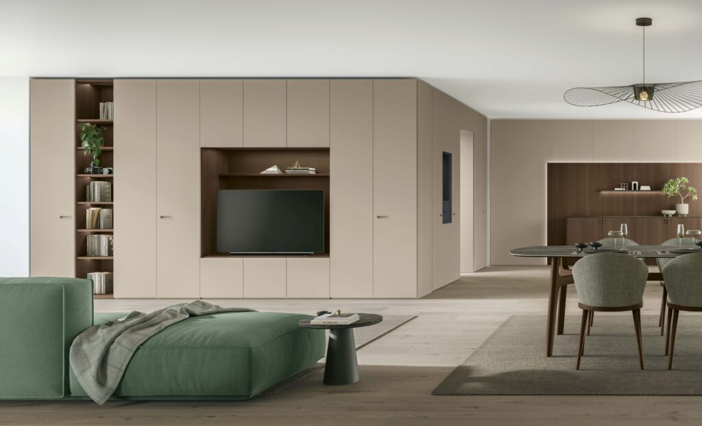 A completare questa visione interviene la boiserie Glove, un inserto materico che aggiunge un livello sensoriale e di comfort alla rigidità dei volumi. Con l’integrazione della boiserie Glove sul sistema Atlante, l’arredo diventa più accogliente e “umano”, trasformando il soggiorno in uno spazio che non si limita a essere abitato, ma che racconta attivamente la personalità di chi lo vive.