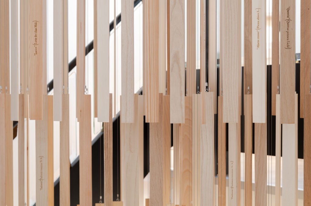 At the heart of the space lies a “conceptual forest”: an installation made of wooden slats in various species, each engraved with its name. These “symbolic trees” rise vertically, evoking the natural structure of a woodland. The vertical dimension is the guiding principle of the design, which ascends across three floors, just as a forest ascends toward the sky.