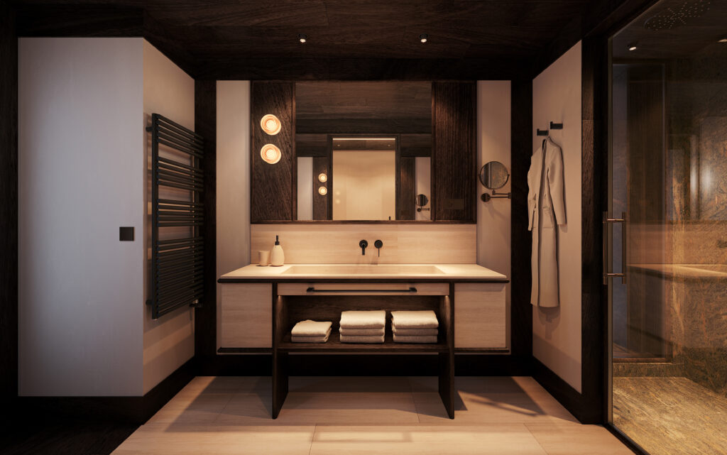 Wood, local stone, steel finishes, and geometric details shape interiors that fuse the warmth of mountain tradition with the elegance of contemporary minimalism. Studio Astet’s design approach enhances the character of the place, bringing a sense of refined authenticity to the resort—perfectly in line with the Aethos brand philosophy.