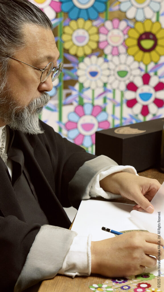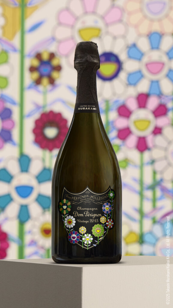 Since 2005, Dom Pérignon has entrusted its creative narrative to legendary names in art and culture. With Murakami, this dialogue becomes even bolder, transforming bottles and coffrets into collectible design objects. The Japanese artist’s pop aesthetic—rich in vivid colors, floral symbols, and visual irony—meets the refined minimalism of the Maison, resulting in a striking and harmonious contrast.