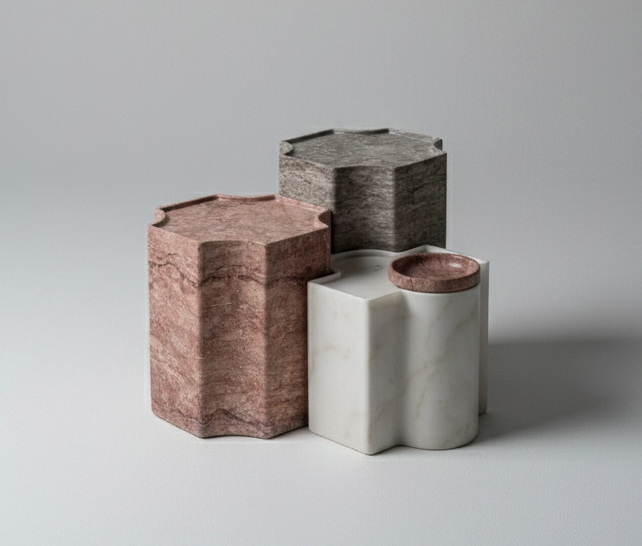 The Desen tables are born from research into historical ornaments, drawing inspiration from Mediterranean tile patterns. Available in three different heights, they can be arranged dynamically to suit any space. The carved base reduces weight without compromising structure, while locally sourced Turkish stones ensure sustainability and authenticity.