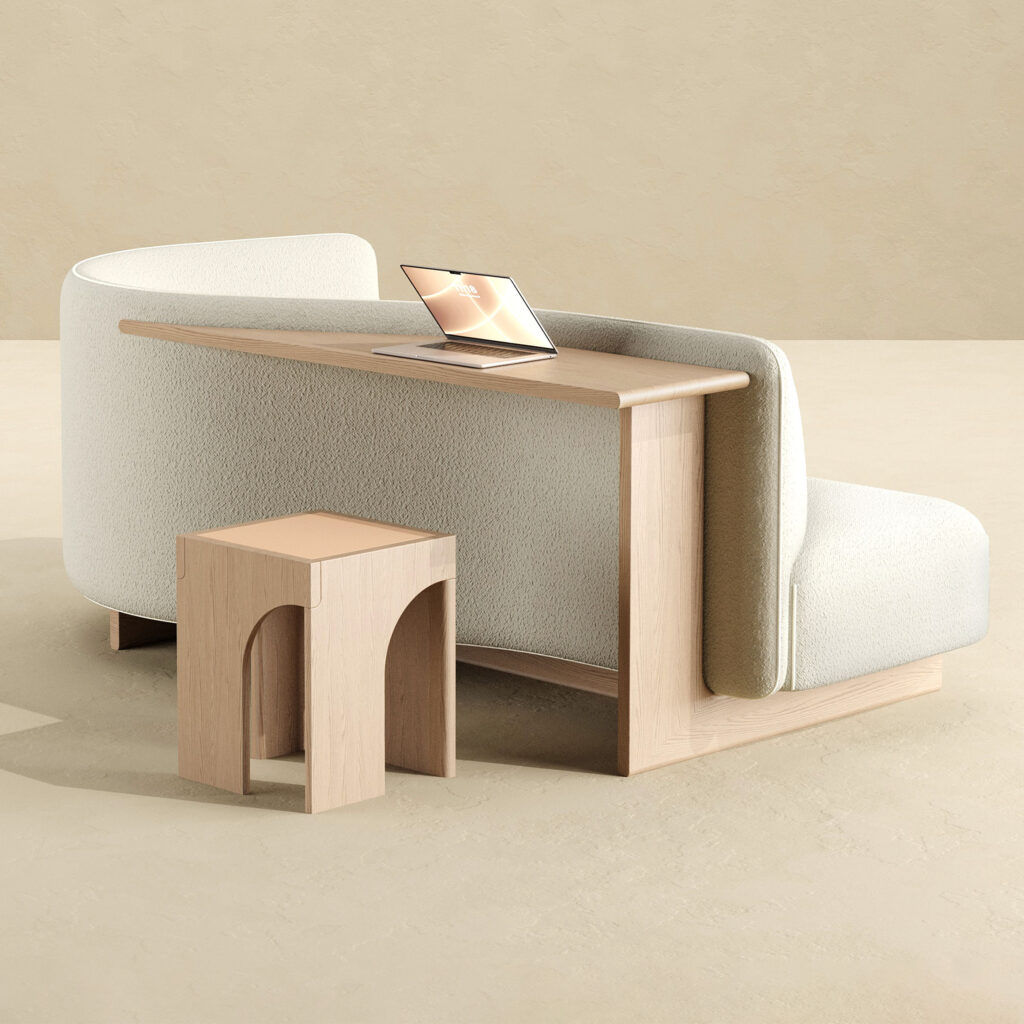 Baia is the heart of the modern living room. Its flowing shape combines seating and a multifunctional desk, ideal for smart working, reading, or relaxing. The curved lines and oak wood base reflect the balance between elegance and practicality. This is not just a sofa—it redefines the space around it.