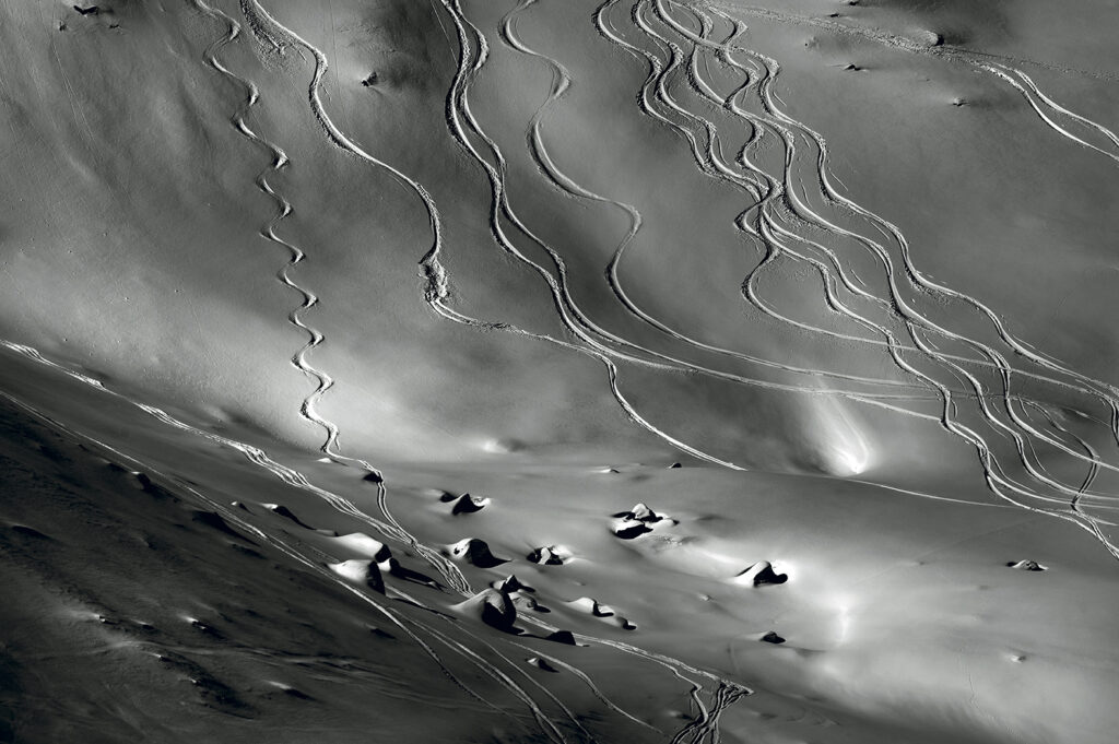 Finally, Tracce (Traces) explores the most intimate side of the landscape. Here, snow serves as the artist’s blank canvas. Zardini captures the lines left behind by skiers, creating a constantly mutating texture. These “traces” represent human impact on the environment in its most poetic form.